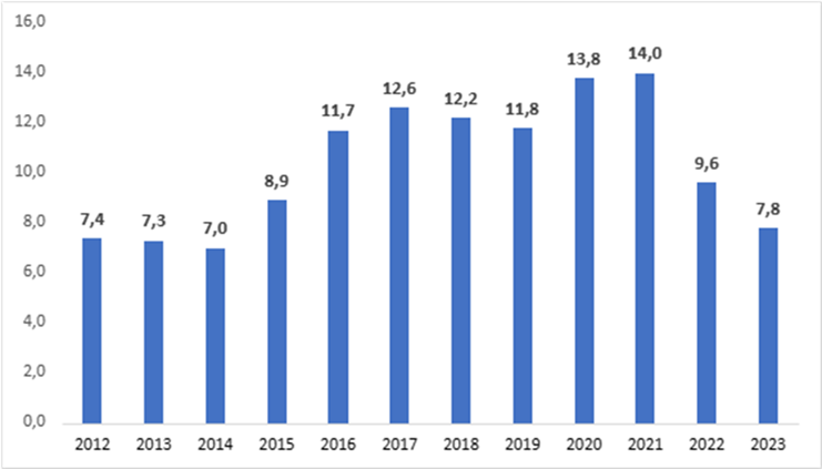 A taxa anual de desocupação foi de 7,8%, recuando 1,8 ponto percentual (p.p.) frente à média de 2022 (9,6%). No confronto contra 2019 (11,8%), o recuo é de 4 p.p. Frente a 2012, quando a taxa média foi de 7,4%, o aumento foi de 0,4 p.p.
