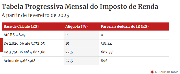 Agora, o limite máximo da faixa de isenção na nova tabela do IR é de R$ 2.259,20, com a aplicação de um desconto simplificado de R$ 564,80 na fonte para aqueles que ganham até R$ 2.824.