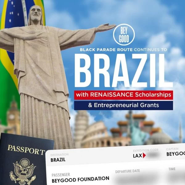 O Brasil pode não ter ganhado o privilégio — até o momento — de receber a Renaissance World Tour, mas o país terá a ajuda de Beyoncé para promover a ascensão do empreendedorismo entre pessoas negras e indígenas. Por meio do projeto Black Parade Route, lançado pela cantora em 2020, bolsas de R$25 mil serão disponibilizadas. A cantora fez um investimento significativo de US$ 1 milhão para apoiar a ação.