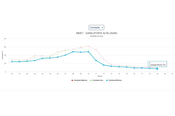 A estação meteorológica de Ponte Alta, no Gama, chegou a registrar umidade mínima do ar de 7% na tarde desta terça-feira (3/9). O valor representa o dia mais seco da história no Distrito Federal.