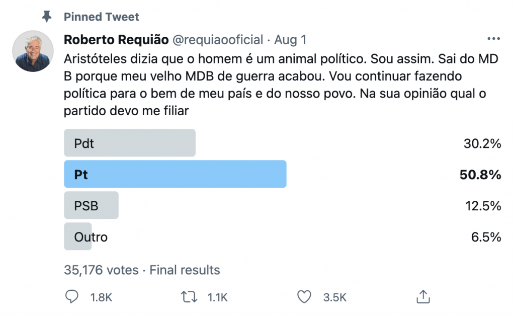 O senador diz que ainda não sabe o seu destino. No tweeter, com mais de 35 mil votos em uma enquete, o PT liderava com mais de 50% das preferências de seus seguidores, contra pouco mais de 30% do PDT.