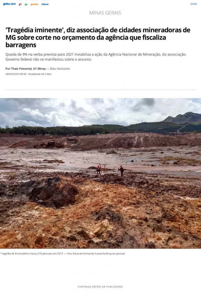 Há ainda um problema adicional, destacado pelos deputados no documento protocolado na Procuradoria-Geral da República em Minas: o orçamento da ANM para 2021 prevê queda de 9%, o que inviabilizará ainda mais a ação do órgão de vistoria.