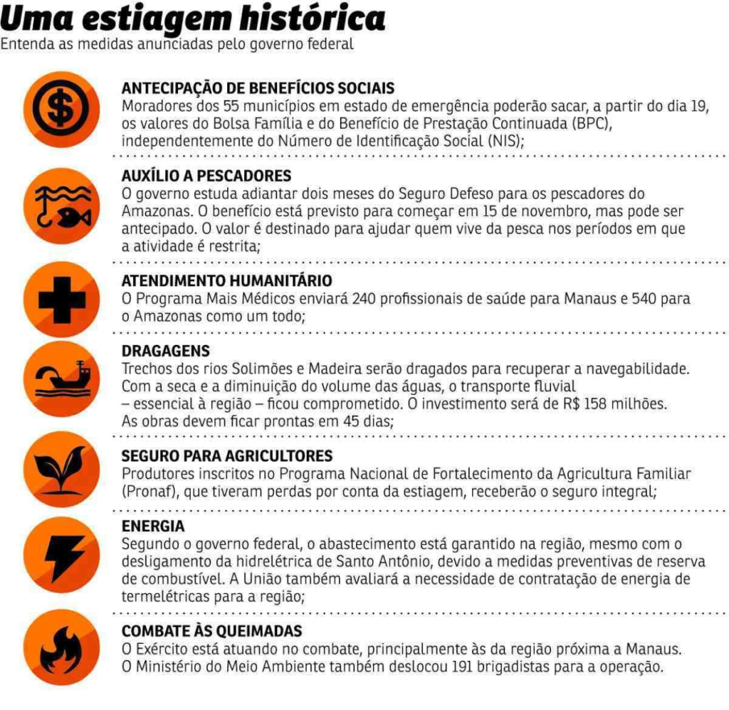 O governo federal adiantará o pagamento do Bolsa Família e o do Benefício de Prestação Continuada (BPC) para os 55 municípios em estado de emergência (de um total de 62) por causa da seca que assola a Região Amazônica. Ontem, uma comitiva formada pelo vice-presidente e ministro do Desenvolvimento, Indústria, Comércio e Serviços, Geraldo Alckmin, e pelos ministros Marina Silva (Meio Ambiente e Mudança do Clima) e Waldez Góes (Integração e do Desenvolvimento Regional) visitou Manaus e sobrevoou as cidades afetadas.