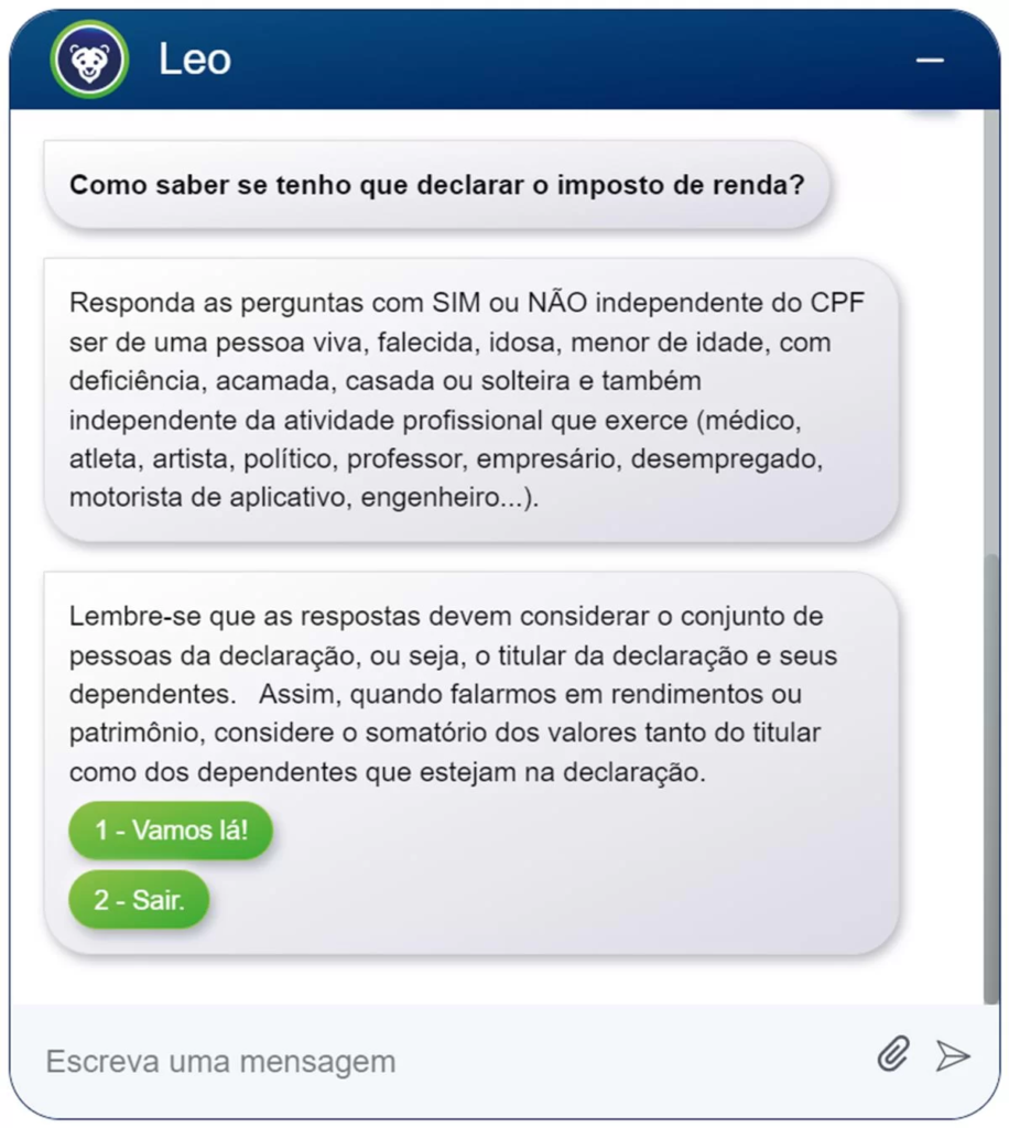 A funcionalidade deverá entrar no ar no próprio dia 15 de março e servirá para todos os que estão na dúvida se devem ou não fazer a declaração do IR 2024. Os últimos detalhes do robô – que deverá se chamar “Leo” (leão, em inglês) – estão sendo ajustados pela equipe técnica do Fisco.
