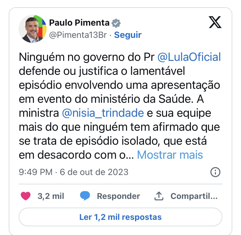 O Ministério da Saúde emitiu uma nota oficial nesta sexta-feira (6), reconhecendo que a apresentação de uma dançarina em um evento realizado na quinta-feira (5), em Brasília, foi considerada “inapropriada”. A pasta lamentou o ocorrido e destacou que essa não representa a política do órgão, destaca o jornalista Igor Gadelha, do Metrópoles.