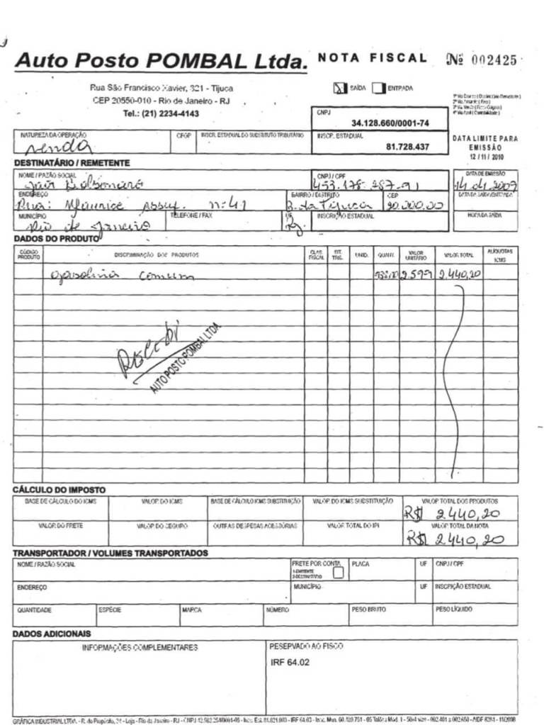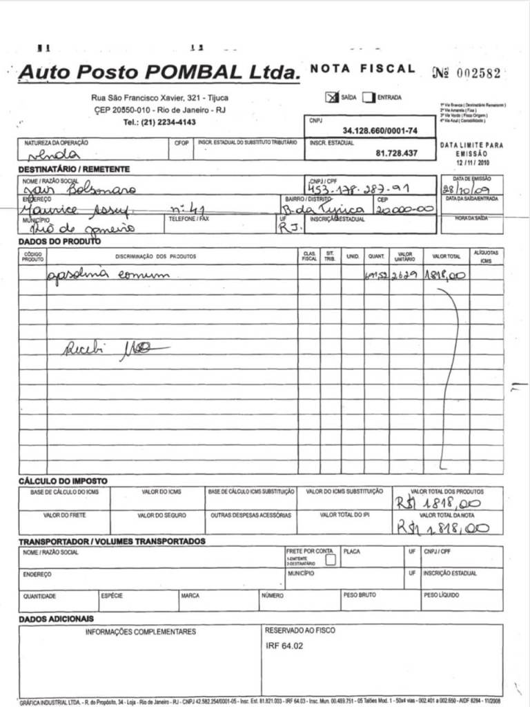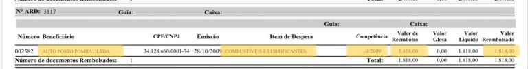 Também em 28 de outubro de 2009, a nota de R$ 1.818,00 (R$ 3.424,20 atuais), emitida no Auto Posto Pombal do Rio para abastecimento de 691,52 litros, encontra o deputado na Sessão Extraordinária Nº 296 do congresso.