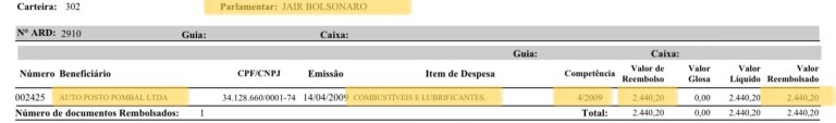 No dia 2 de junho de 2009, quando realiza despesa de R$ 2542,00 (R$ 4.765,28 atuais) no Posto Rocar carioca, Jair Bolsonaro estava presente na Sessão Extraordinária Nº 133, em Brasília.
