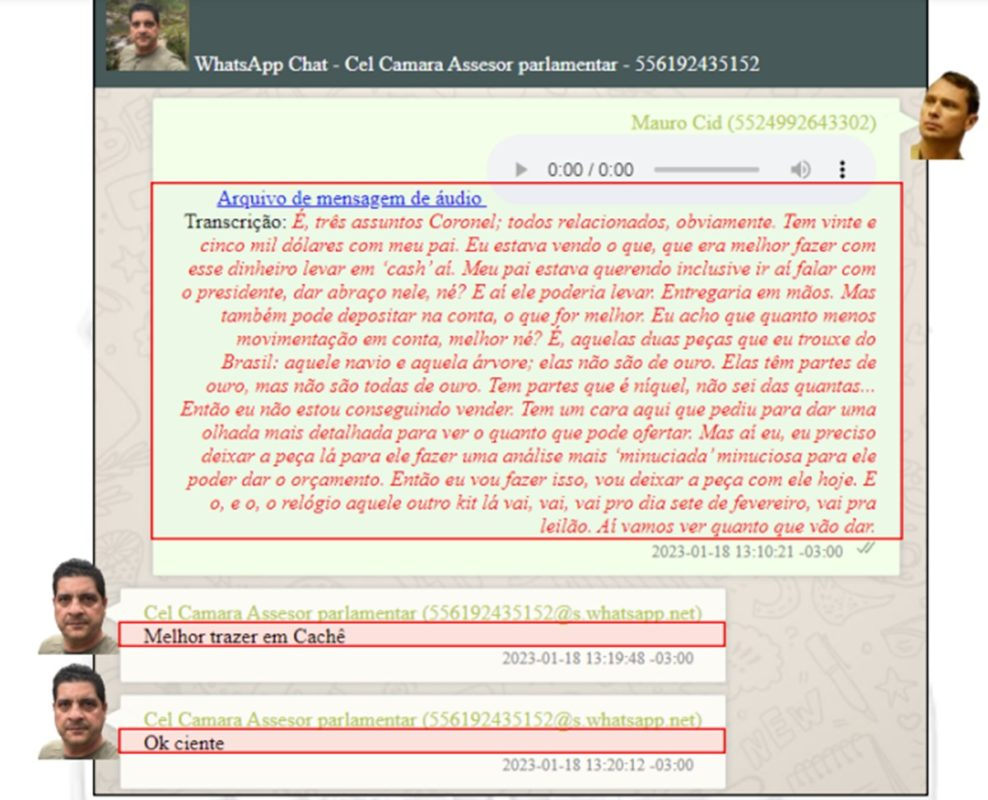 A conversa ocorre em 18 de janeiro de 2023, quando Câmara estava com Bolsonaro em Orlando, nos Estados Unidos. O ex-ajudante de ordens diz que tem US$ 25 mil com o pai dele, o coronel Lourena Cid, e que isso poderia ser entregue em “cash”.