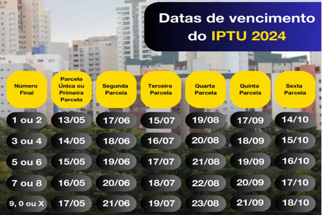 O calendário oficial de pagamento do Imposto sobre a Propriedade Predial e Territorial Urbana (IPTU) de 2024 já está disponível. A portaria, que fixa as datas de vencimento das parcelas do imposto e da Taxa de Limpeza Pública (TLP), foi publicada, nesta sexta-feira (8), no Diário Oficial do Distrito Federal (DODF). Os contribuintes poderão quitar a taxa em conta única com direito a 10% de desconto, ou em seis parcelas iguais e sucessivas.