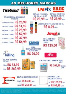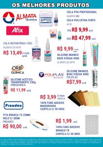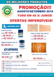 Neste mês agosto setembro, não deixe de conferir as ofertas da TerraViva Madeiras. Uma grande promoção está sendo feita em produtos de vários tipos e marcas. Produtos das marcas Almata Química, Afix, Poliplax, Proadec, Titebond estão com os melhores preços do mercado. Há ainda as marcas Kiling, Ciano e Siloc. Sem contar as máquinas da Inmes e as corrediças das marcas Albras e dobradiças da Cermag.