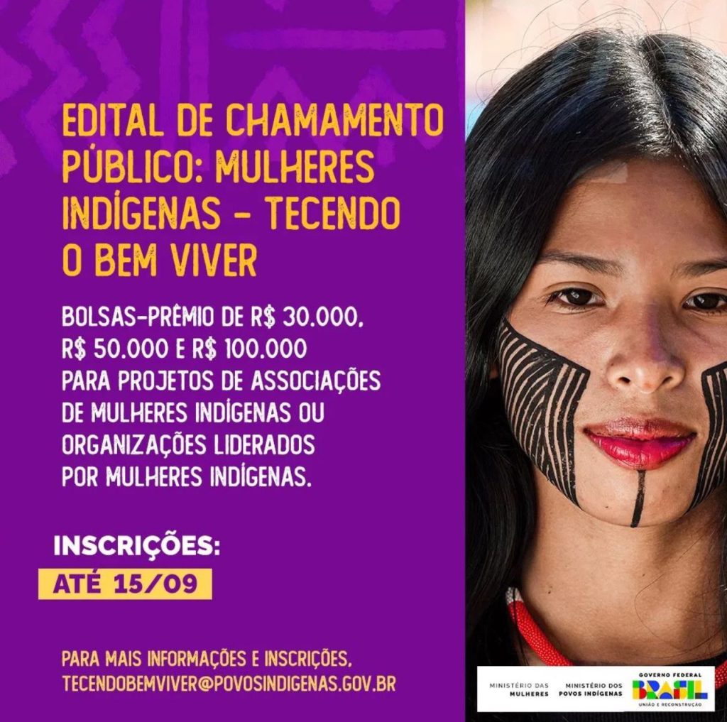 Atento à importância de preservar saberes e práticas das comunidades indígenas no Brasil, o governo Lula, por meio dos Ministérios das Mulheres e dos Povos Indígenas, lançou o edital de chamamento público Mulheres Indígenas: Tecendo o Bem Viver. A ação vai disponibilizar o total de R$ 1 milhão para iniciativas de associações ou organizações lideradas por mulheres indígenas no país, que podem realizar as inscrições gratuitas até o dia 15 de setembro.