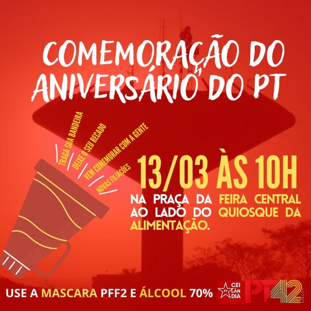 Olá companheiros/as, como a nossa atividade de comemoração aos 42 anos do nosso partido foi adiada por conta das chuvas, realizaremos no dia 13 março (próximo domingo), às 10 horas da manhã, na Praça da Feira Central de Ceilândia, ao lado dos quiosque de alimentação.