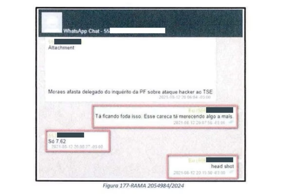 Na conversa com Marcelo Araújo Bormevet, policial federal, os dois chegaram a falar de tiro de fuzil após o compartilhamento de uma notícia informando que Moraes havia afastado um delegado da PF do inquérito sobre ataque hacker ao TSE. Quando Giancarlo diz que o ministro merecia “algo a mais”, Bormevet respondeu: “7.62”, fazendo referência a um tiro de fuzil. Giancarlo ainda complementou: “head shot”, que siginifca tiro na cabeça.