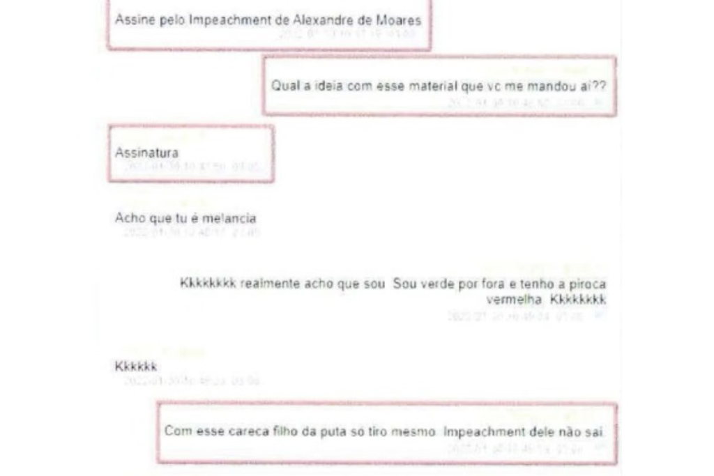 Em outra conversa, os dois falam sobre um abaixo-assinado pelo impeachment de Moraes. Bormevet envia para Giancarlo, que questiona do que se trata aquilo. Marcelo, então, responde que quer a assinatura do colega e brinca: “Acho que tu é melancia”, fazendo referência aos militares do Exército que usam uniforme verde, mas seriam vermelhos, ou seja, de esquerda, por dentro.