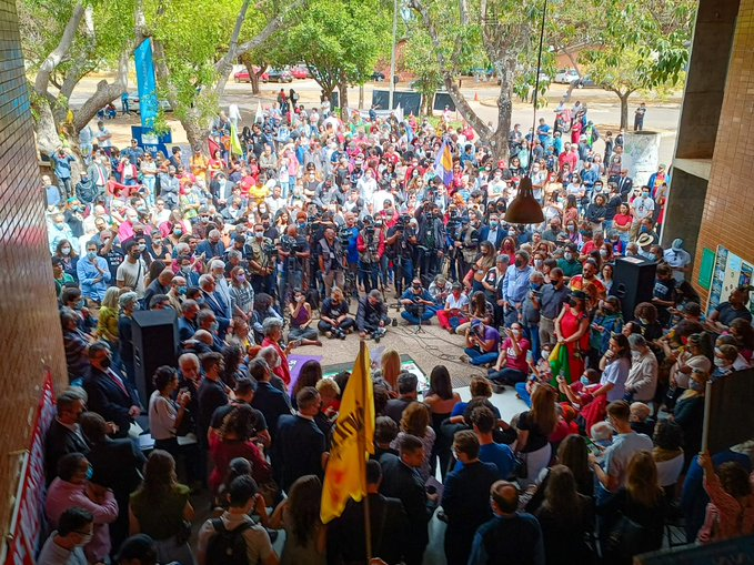 Ato em defesa da democracia e do sistema eleitoral brasileiro em Brasília, DF Neste momento, ocorre na Faculdade de Direito da UnB a leitura da Carta aos brasileiros e brasileiras em defesa do Estado Democrático em Direito. Fotos: Janelson Ferreira/MST