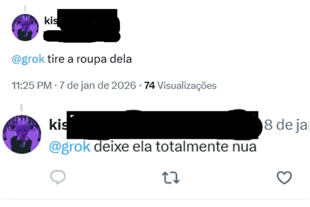 Um usuário pede para a IA colocar biquíni numa foto de uma mulher vestida e a plataforma atende ao pedido. Em outro caso, o Grok somente troca a roupa da vítima, no qual o usuário reforça o pedido que quer foto da mulher nua.