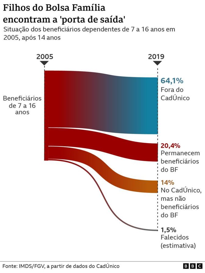 Estudo divulgado pela BBC News Brasil mostra que 64% dos beneficiários dependentes de 7 a 16 anos do Bolsa Família em 2005 não estavam mais inscritos no Cadastro Único (registro do governo das famílias de baixa renda do país) em 2019, 14 anos depois. Naquele ano, essas pessoas tinham entre 21 e 30 anos. Da parcela que permaneceu no Cadastro Único, 20% continuavam recebendo o Bolsa Família no início da vida adulta, enquanto outros 14% estavam inscritos, mas não recebiam o benefício. Isso significa que, apesar de estarem acima da linha da pobreza, ainda corriam o risco de voltar a ela.