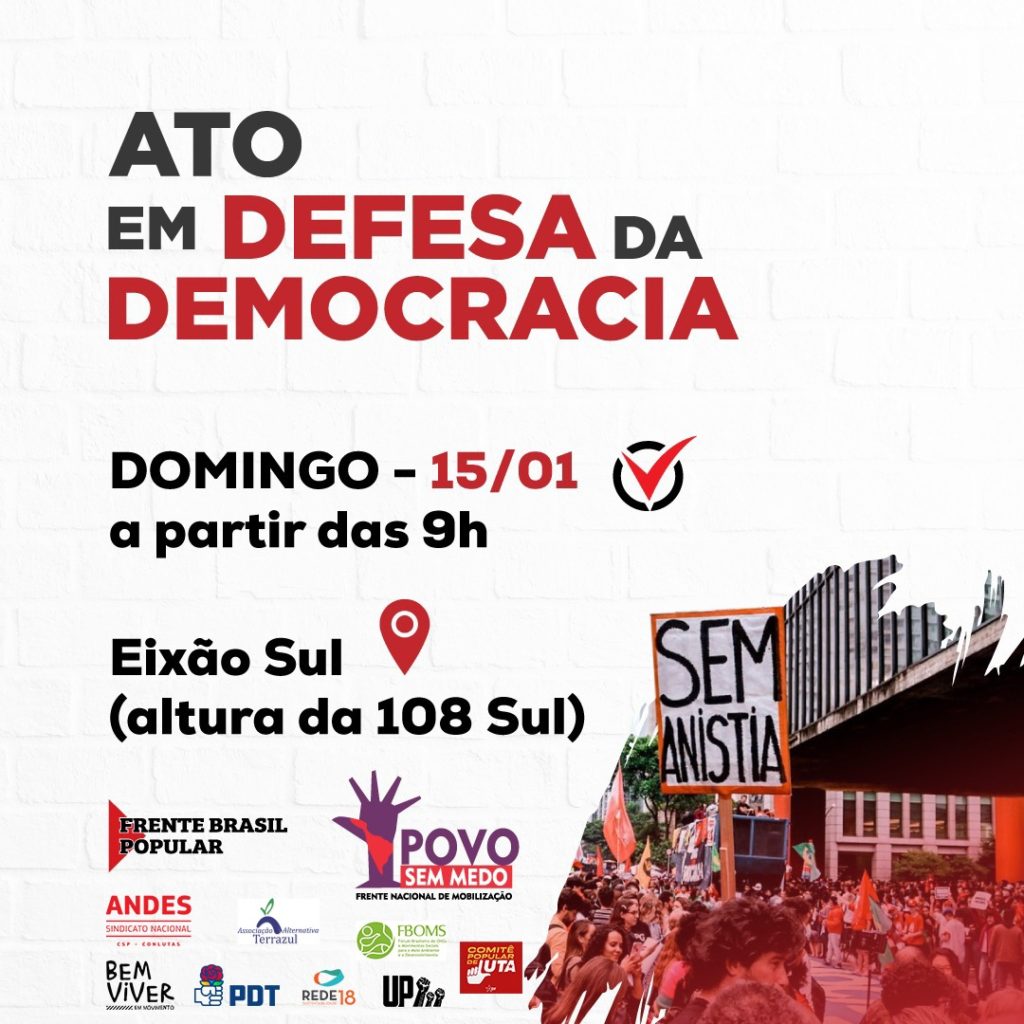 No próximo domingo, dia 15, a partir das 09h00, no Eixo Sul (altura da 108), vamos nos reunir para celebrar a democracia e defender o Estado Democrático de Direito.
