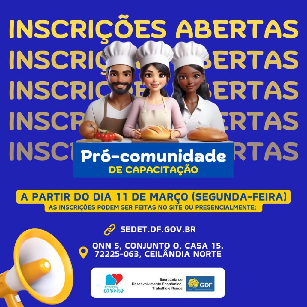 O Instituto do Carinho de Ceilândia, em parceria com a Secretaria de Desenvolvimento Econômico, Trabalho e Renda do Distrito Federal (SEDET), anunciou hoje, 11 de março, o lançamento do edital para o projeto Pró-Comunidade de Capacitação.