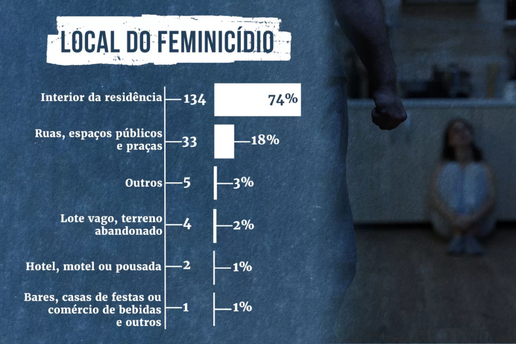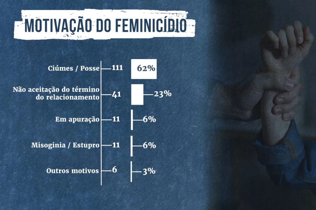 Também é comum que mulheres morram dentro da própria casa, como aconteceu em 74% dos feminicídios do DF. Outro dado que chama atenção mostra que dos 180 feminicídios ocorridos no DF entre 2015 e 2023, 111 tiveram como motivação posse e/ou ciúme, o que corresponde a 62% dos casos.
