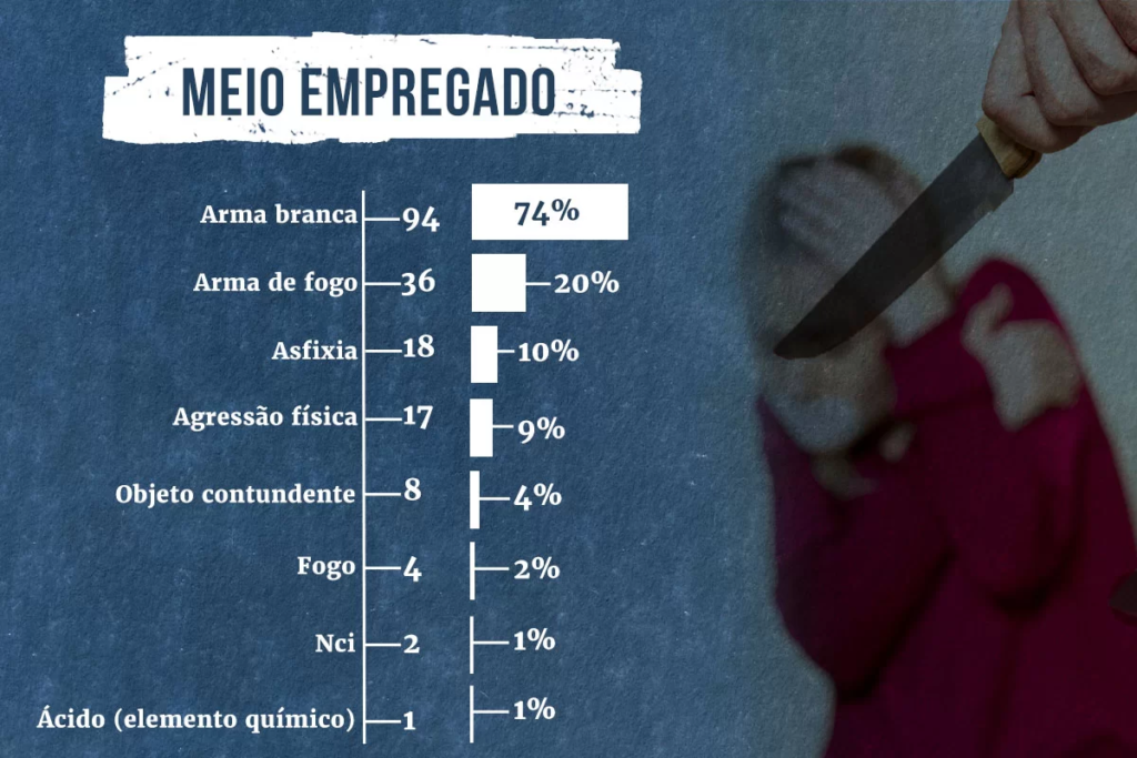 Armas de fogo são o segundo instrumento mais comum utilizado em feminicídios no DF, atrás somente de armas brancas, com o dobro de casos do terceiro meio mais usado, a asfixia. Até dezembro de 2023, em 94 assassinatos de mulheres motivados pelo gênero foram usados instrumentos como facas, machados ou martelos, por exemplo. Em 36, armas de fogo. Houve asfixia em 18, agressão física em 17 e “objeto contundente” em 8.