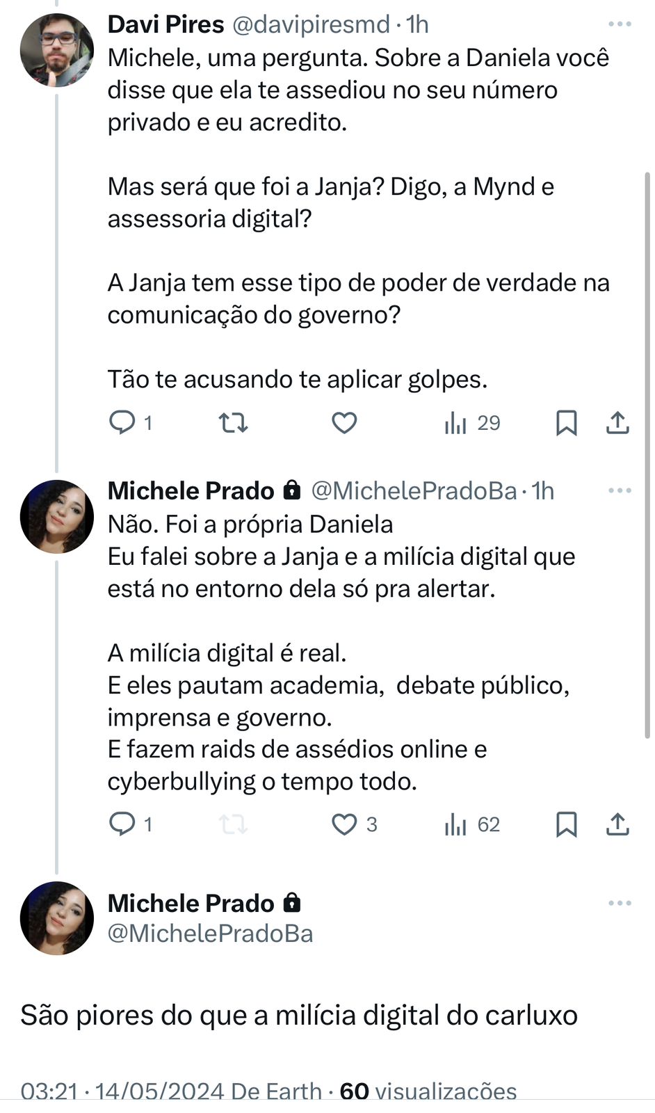 Seu desabafo já está sendo capitalizado pelos bolsonaristas. O deputado Nikolas Ferreira diz que vai entrar com “requerimento” para convidar a “Jornalista”(sic) Michele Prado, para “prestar esclarecimentos sobre suas alegações de milícia digital criada pela 1ª dama” e “gabinete do ódio” e “manipulação da opinião pública realizada por meios de comunicação”.