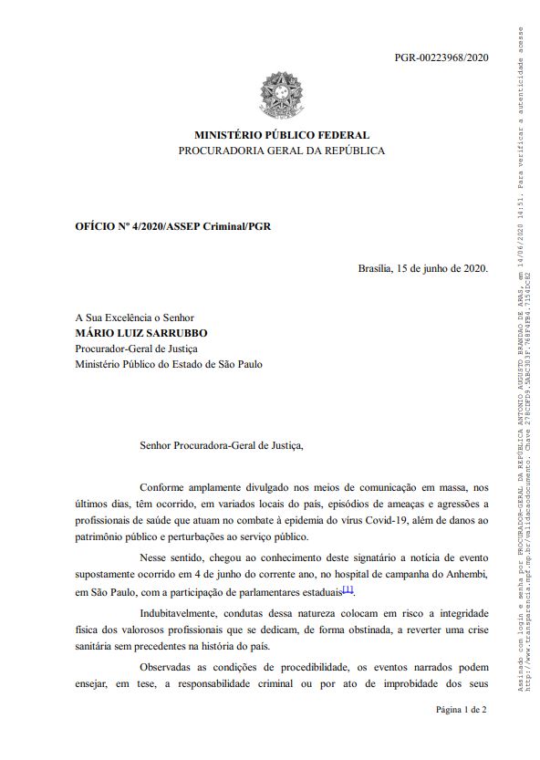 “Indubitavelmente, condutas dessa natureza colocam em risco a integridade física dos valorosos profissionais que se dedicam, de forma obstinada, a reverter uma crise sanitária sem precedentes na história do país”, escreveu Aras no ofício enviado a Mário Luiz Sarrubbo, procurador-geral de Justiça do Estado de São Paulo.