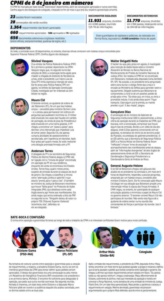 A Comissão Parlamentar Mista de Inquérito (CPMI) do 8 de janeiro chega ao fim nesta semana. Amanhã, a relatora, senadora Eliziane Gama (PSD-MA), vai apresentar o relatório com a conclusão dos trabalhos realizados pelo colegiado ao longo dos últimos quatro meses e meio, com votação do texto prevista para quarta-feira. As expectativas de um desfecho conclusivo são poucas, devido a muito bate-boca e poucos avanços durante o processo.
