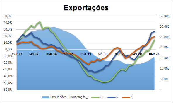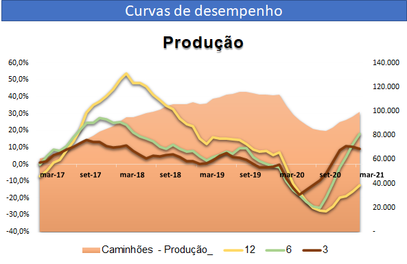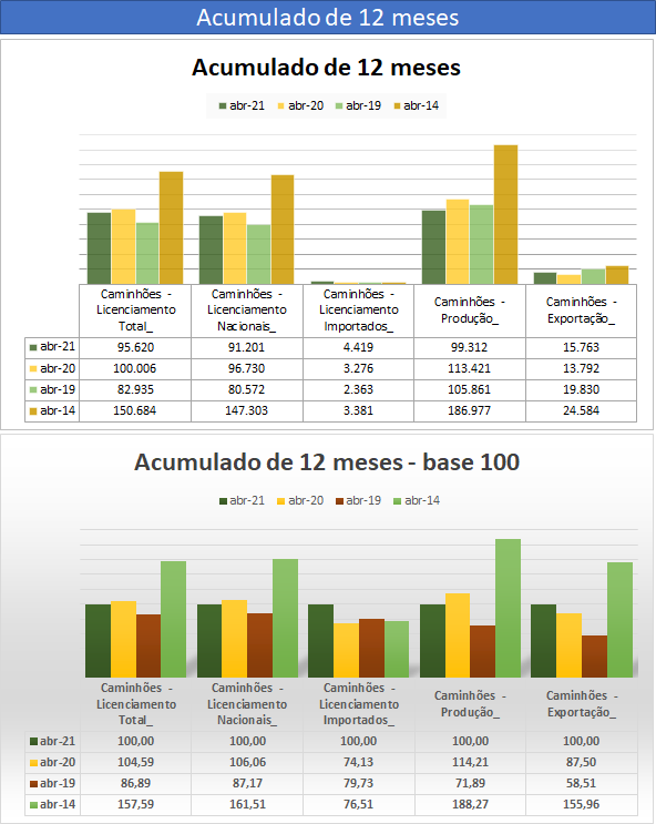 Tomando por base abril 21 =100, percebe-se que, em relação a abril de 2020, houve uma queda de 106,06 para 100 no licenciamento nacional. A produção de caminhões caiu de 114,21 para 100. Houve aumento nas exportações de 87,50 para 100.