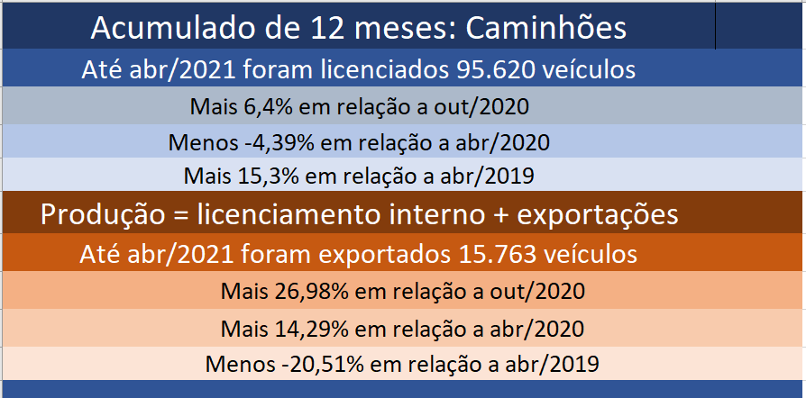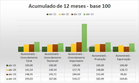Nos 12 meses encerrados em abril, houve um aumento no licenciamento em relação a outubro passado, mas ficou 4,39% abaixo de abril de 2020.O licenciamento é a melhor medida para o mercado interno.