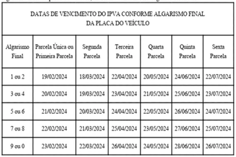 As demais datas de vencimento ficam definidas com base no último algarismo da placa do veículo.