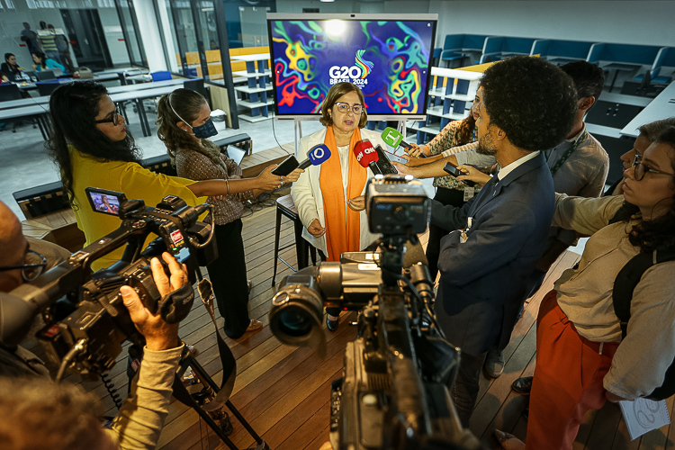 A coordenadora do Grupo de Trabalho de Empoderamento de Mulheres do G20 e assessora do Ministério das Mulheres, Ísis Táboas, concedeu entrevista coletiva nesta quinta-feira (18) para explicar como foi a primeira reunião técnica do GT que debate as estratégias de fortalecer a pauta das mulheres no mundo, encerrada nesta quinta-feira, 18.