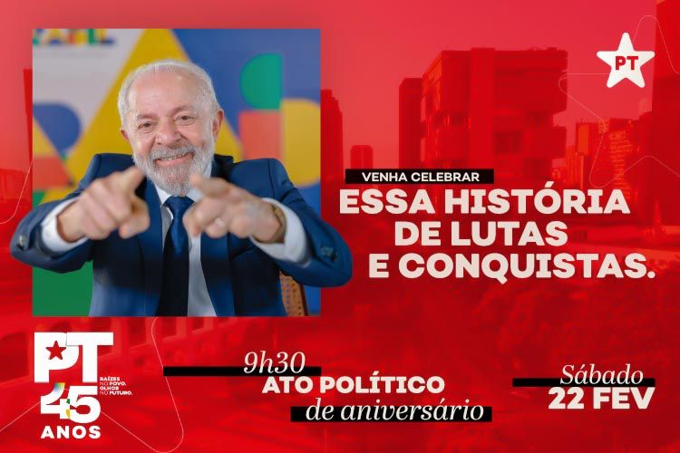 O Partido dos Trabalhadores e das Trabalhadoras convida toda a militância para comemorar os 45 anos de sua fundação nos próximos dias 21 e 22 de fevereiro, com a presença do presidente Lula em uma grande festa popular na cidade do Rio de Janeiro.