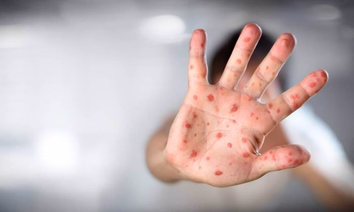 - Cerca de 3 dias após surgem manchas vermelhas na pele, com início na face e atrás do pescoço, progredindo em direção aos membros inferiores, com duração de aproximadamente três dias, e desaparece na mesma ordem de aparecimento.
