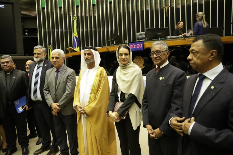Após a Sessão Solene, o presidente do Conselho Global da Tolerância e da Paz (GCTP), Ahmed Bin Mohammad Al-Jarwan, concedeu uma entrevista coletiva à imprensa no Salão Verde da Câmara dos Deputados.