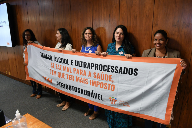 Em audiência no Senado, equipe da ONG ACT Promoção da Saúde exibe banner pedindo aumento de imposto para tabaco, álcool e ultraprocessados