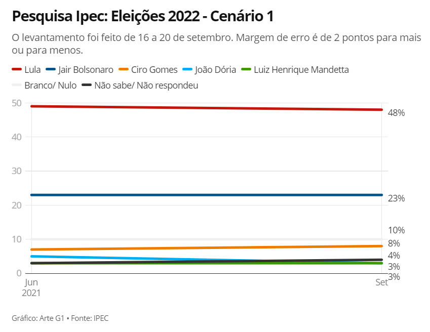 O levantamento do Ipec foi feito de 16 a 20 de setembro e ouviu 2.002 pessoas em 141 municípios. A margem de erro é de 2 pontos para mais e para menos. O nível de confiança é de 95%.