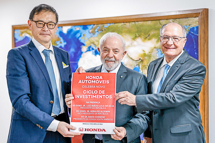 “Novo ciclo de investimentos da Honda no Brasil”, postou o presidente Lula em suas redes com foto ao lado do vice-presidente Geraldo Alckmin e do vice-presidente comercial da Honda Automóveis do Brasil, Roberto Akiyama.