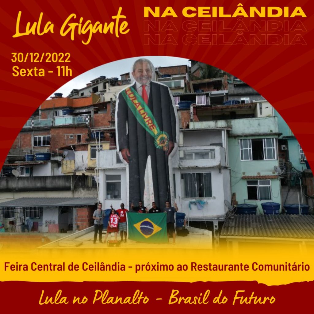 Vem ao centro de Ceilândia com um grande Boneco Inflávio gigante do Lula, também um som, vai haver falas de lideranças em agradecimento e com saudações aos eleitores e todos os Ceilandenses em nome do nosso presidente #LuisInácioLuladaSilva