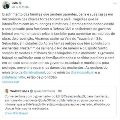 “O sofrimento das famílias que perdem pais, bens e suas casas em decorrência das chuvas fortes tocam o país. Tragédias que se intensificam com as mudanças climáticas. Estamos trabalhando desde o ano passado para fortalecer a Defesa Civil e a assistência do governo federal em momentos de crise, e também para aumentar os recursos de obras de prevenção”, ressaltou o presidente.