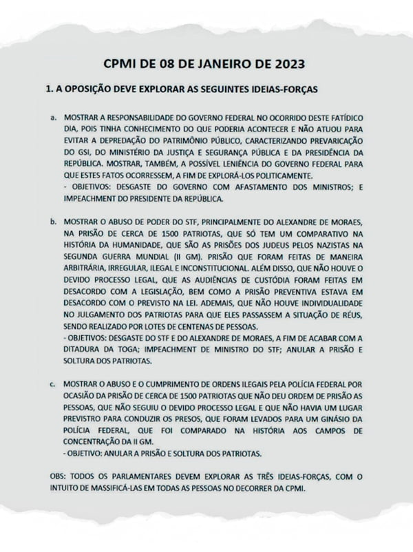O documento traz orientações que deveriam ser exploradas pela oposição visando atacar o governo federal, o STF, o ministro Alexandre de Moraes e a Polícia Federal (PF).