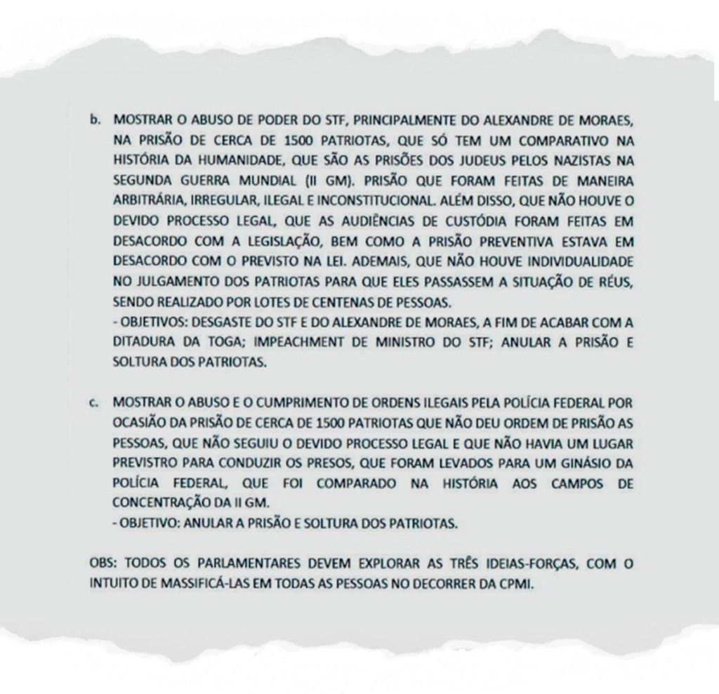 Em relação a Moraes e ao STF, a orientação era dizer que prisão dos “patriotas” se comparava à prisão dos judeus pelos nazistas. Além disso, era para argumentar que as prisões foram arbitrárias, e as audiências de custódia, feitas em desacordo com a legislação. “Ademais, que não houve individualidade no julgamento dos patriotas para que eles passassem a situação de réus, sendo realizado por lotes de centenas de pessoas.”