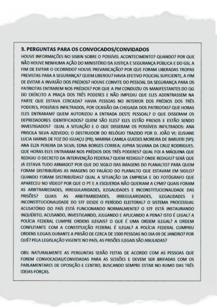 O roteiro também lista autoridades que devem ser convocadas (como o então ministro da Justiça Flávio Dino e o ex-ministro do GSI general Gonçalves Dias) e faz sugestões de inúmeras perguntas.