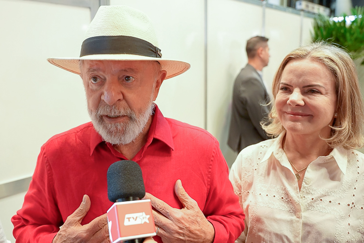 Presidente Lula, ao lado da presidenta nacional do PT, Gleisi Hoffmann, durante as comemorações dos 45 anos do PT