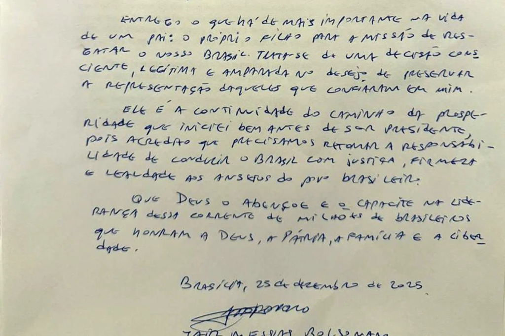 “Ao longo da minha vida tenho enfrentado duras batalhas, pagando um preço alto, com minha saúde e família, para defender aquilo que acredito ser o melhor para o nosso Brasil”, inicia Bolsonaro na carta, que foi lida por Flávio para jornalistas. “Diante desse cenário de injustiça, e com o compromisso de não permitir que a vontade popular seja silenciada, tomo a decisão de indicar o Flávio Bolsonaro como pré-candidato à Presidência da República em 2026”, segue ele.