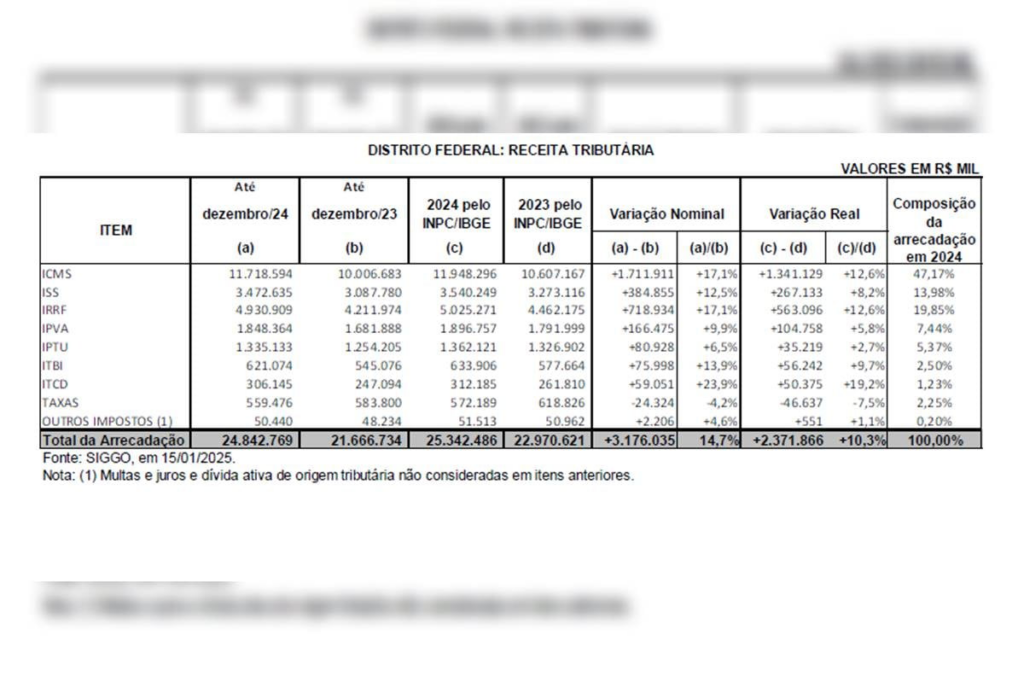 O Distrito Federal arrecadou R$ 24,8 bilhões com impostos em 2024, 14,7% a mais do que em 2023, de acordo com dados da Secretaria de Economia do DF.