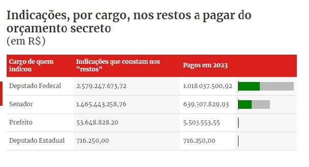 O pagamento das emendas de relator no governo Lula, conhecidas no governo Jair Bolsonaro como orçamento secreto, beneficiou aliados à gestão atual na Câmara dos Deputados e no Senado. Embora o governo Bolsonaro tenha definido os beneficiários dos pagamentos, foi o atual que definiu a ordem dos pagamentos dos restos, que já estão em cerca de R$ 3 bilhões.