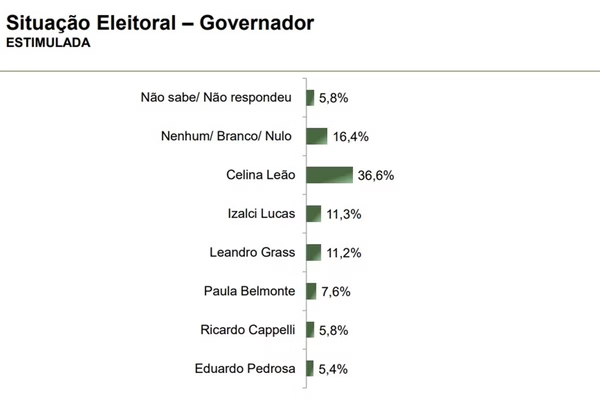 Celina Leão tem 36,6% das intenções de voto. Ainda entre eventuais candidatos a governador, o senador Izalci Lucas (PL) fica com 11,3%, e o presidente do Instituto do Patrimônio Histórico e Artístico Nacional (Iphan), Leandro Grass (PV), 11,2%.