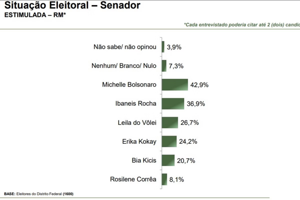 Na corrida para o Senado, a ex-primeira-dama do país Michelle Bolsonaro tem 42,9% das intenções de voto, enquanto Ibaneis Rocha soma 36,9% delas. A senadora Leila Barros (PDT-DF) aparece em terceiro lugar, com 26,7%.
