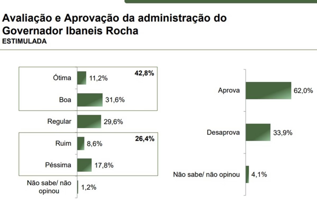 O estudo também aponta a aprovação da gestão de Ibaneis Rocha. Reeleito em 2022, o atual governador tem 62% de aprovação entre eleitores, segundo o Paraná Pesquisas.